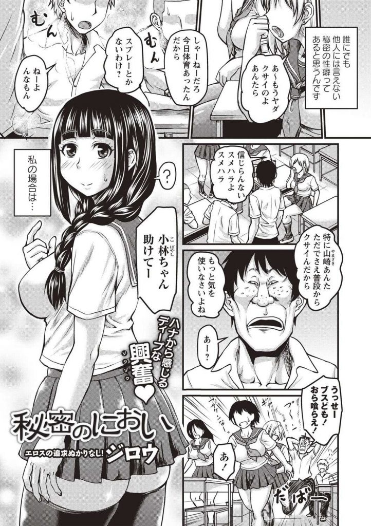 【エロ漫画】地味目な三つ編みJKは極度の臭いフェチでブサ男の体臭に発情してトロけ面でチンポを咥えフェラチオアクメ!