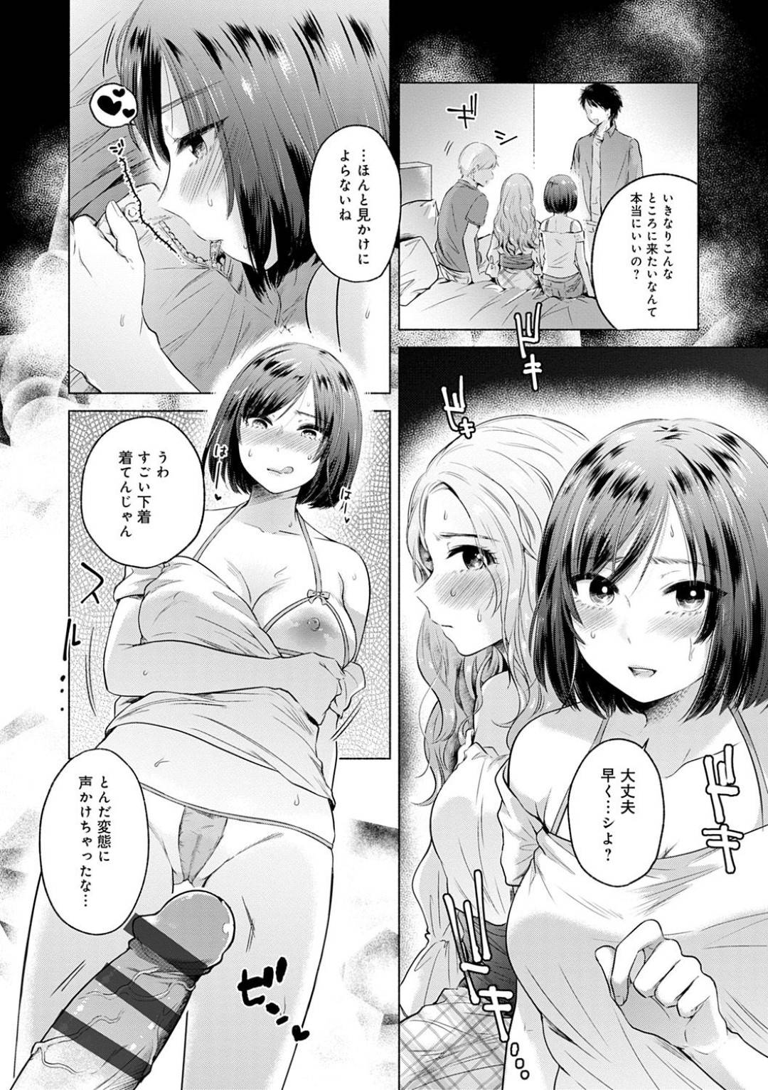 【エロ漫画】同級生の清楚系のJKの文野と一緒にナンパ男と乱交セックスする羽目になったギャルJKの姫川…見た目に反して淫乱な文野は積極的に男に求めてはイキまくり、一方で姫川は処女喪失セックスで中出しまでされてしまう。