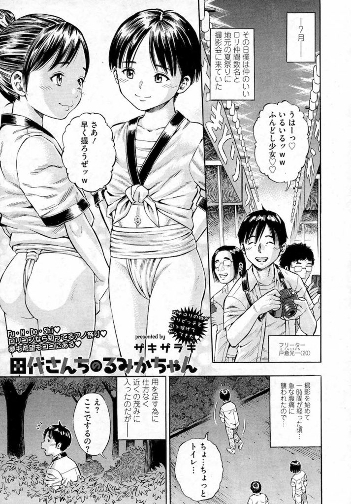 【エロ漫画】夏祭りのふんどし少女を撮影に来たロリコン男が草陰で援交する隣の娘を見て口止めにロリビッチの幼い体を堪能する!