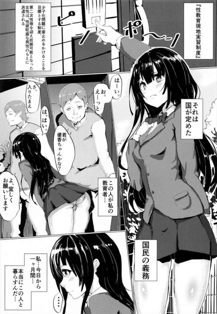 少子化に歯止めをかけるための性教育現地実習制度に応募した国民の義務を全うする処女JKが教育者のおじさんの家に一か月住み込み録画用のカメラが回る中で口マンコを犯され発育の良い体を愛撫されてバージンを喪失し一から開発されてマニアックなプレイもこなすいやらしい肉体に成長すると卵子を排出したての危険日マンコで中だし受精アクメ!