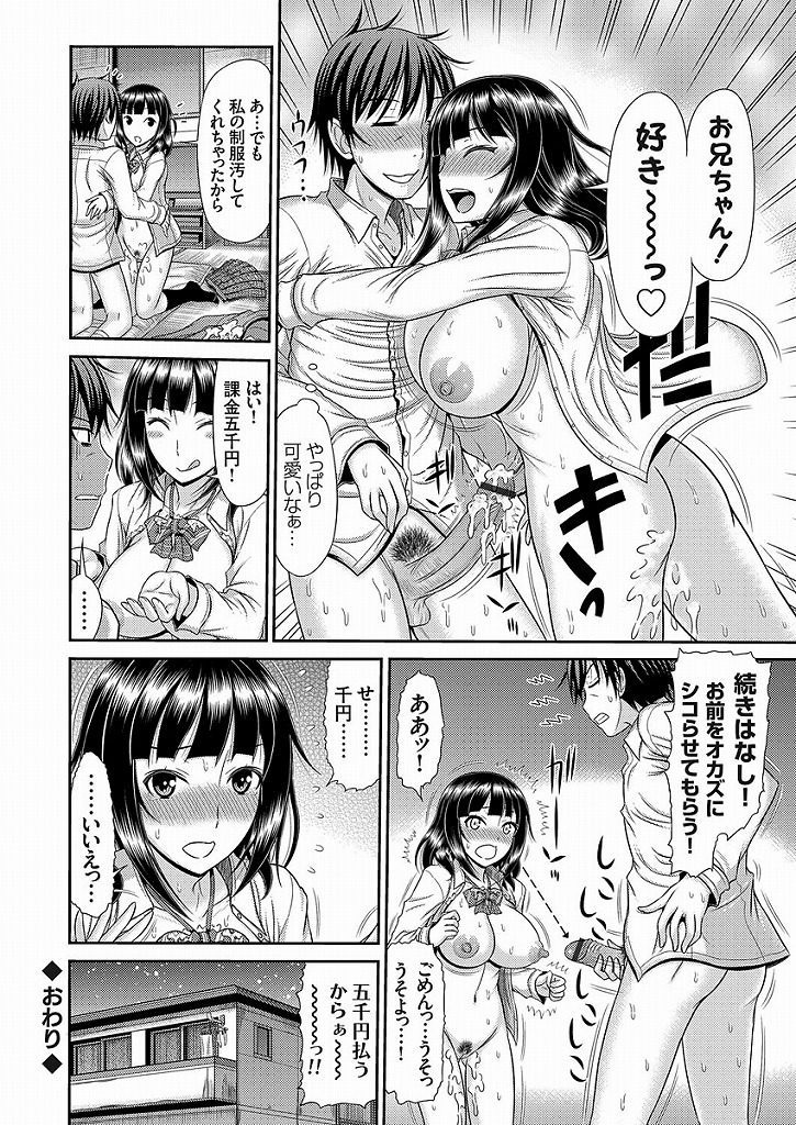 【エロ漫画】好きな兄と課金で肉体関係を成立させてるドスケベJKが焦らされ自らお金を払って肉棒懇願いちゃラブ近親相姦! おもらしバックみよし誘惑輪姦 マイページに追加 マイページへ移動 女子寮のある学校に進学したJK妹が両親に言われて時々兄の様子を見に家に来てやたらと課金を迫ってお金をせびっていく!ドスケベボディを見て勃起すると課金で口内処理をしてくれて肉体関係までもお金によって成立していた!愛撫するたびにオプションとしてお金がかかるので兄が見抜きでシころうとしたら妹自ら課金で挿入懇願しいちゃラブ近親相姦! 関連エロマンガ 全裸で鎖につながれ飢えた男性受刑者に囲まれ犯される元アイドルの死刑囚。バイブをねじ込まれ男たちにおっぱいを揉まれながら中出しレイプ 先生に薬物を飲まされ調教される彼氏とラブラブなJK。乳首ピアスをされて肉便器にされると彼を忘れて先生のチンポで堕ちてしまう 夫にバイブでイカされまくる義母。欲求不満な彼女と夫に隠れてセックスをしまくる息子はJKの義妹ともお風呂場でいちゃラブセックスする 義母の命令で親父たちに輪姦される姉。乳首を舐められ弟に無理やりクンニさせてザーメンまみれで中出しレイプされる 街中で通る男性にオナニー鑑賞をせがまれるドSなJDお姉さん。ディルドでフェラを強要させてヒールでアソコを踏み潰し逆レイプで中出しさせてあげる 住み込みで働く男性を性処理として働かせる欲求不満な人妻。セックス依存症のの母娘たちは彼とセックスしまくり中出しする ピアノレッスンで講師にセクハラを受け続けるお姉さん。後ろからおっぱいを揉まれ手マンをされると興奮してしまった彼女は講師のチンポをフェラして生ハメセックスをする 家主の親父にご奉仕状況される喫茶店を経営するメイド姿の未亡人。パイズリやクンニをして立ちバックで生ハメされて犯されアヘ顔で中出し おもらしバックみよし誘惑輪姦 コメントを残す コメントをキャンセル コメント 名前 email confirm* post date* 漫画に関係の無いコメントや荒らし行為はご遠慮ください。