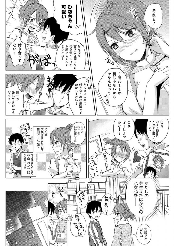 昔から可愛げや女らしさと無縁の人生を送るJKが自分を変えようと喫茶店のバイトを始めると学校の後輩男子に出会い無邪気ながらも押しの強い男子に乙女心が芽生えデートをするがラブホから逃げ出し気まずい気持ちのままバイトに行くといつもと変わらない態度の男子とまともに顔を見て話せず始め初めての恋に戸惑いながら覚悟を決めて初Hする!