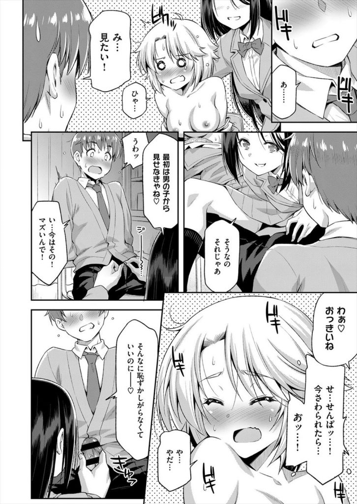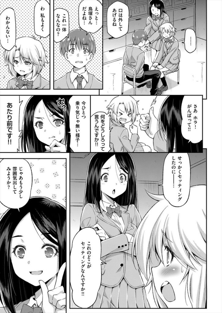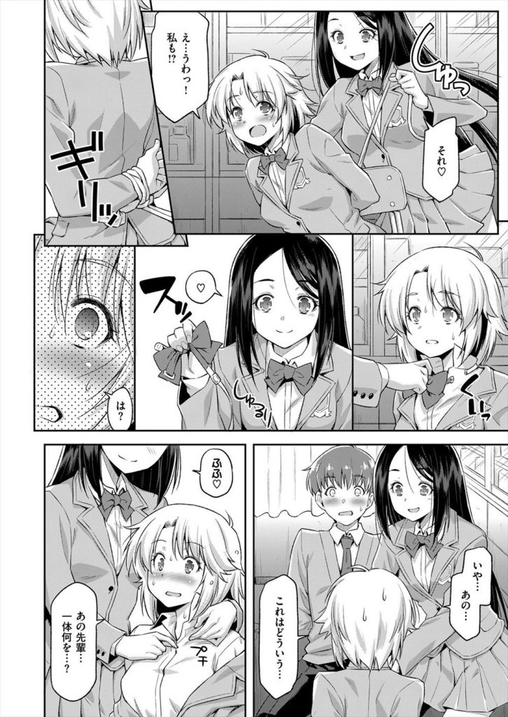 【エロ漫画】好きな人を隠し撮りする美少女JKにお膳立てする先輩が放課後に二人を拘束し局部を見せ合わせ強引にハメさせる!