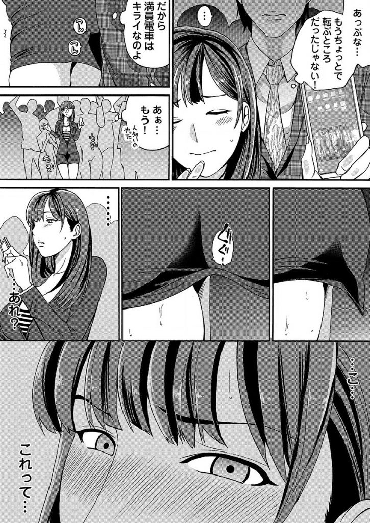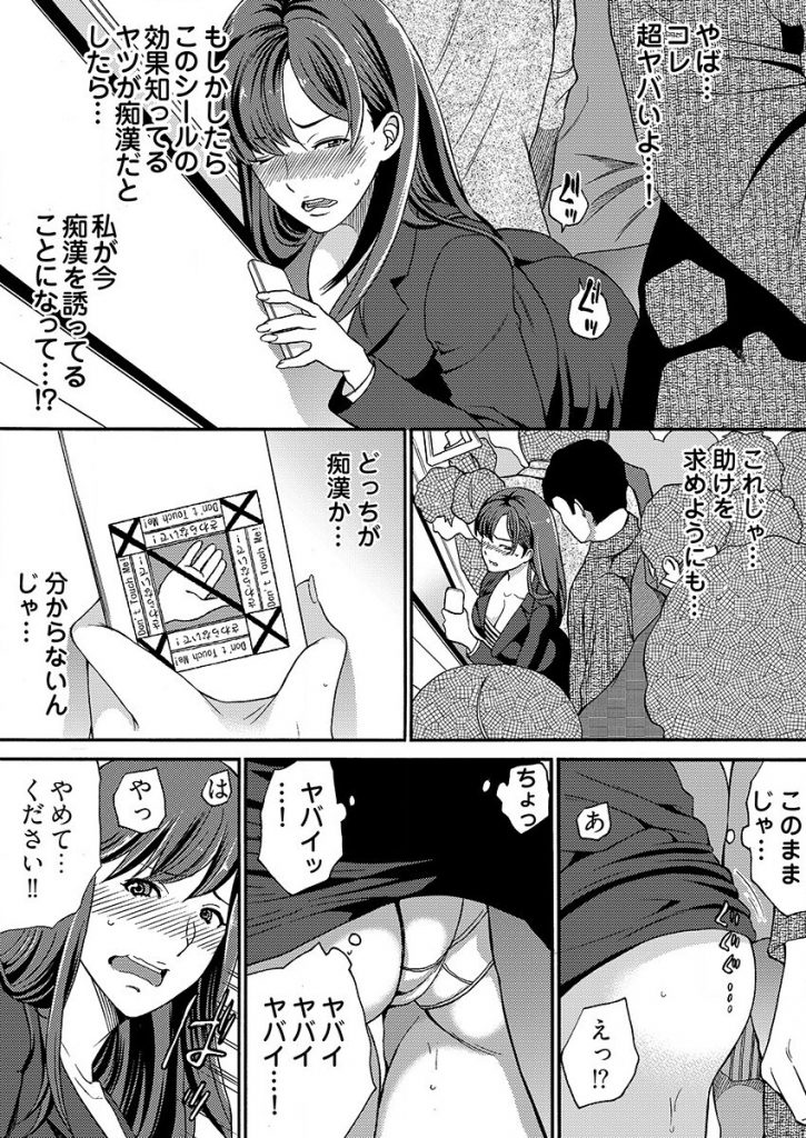 【エロ漫画】嘘や噂を全てHな意味で捉えるOLが痴漢に遭うシールを貼って電車に乗り勝手に発情して痴女っぽく男を挑発!