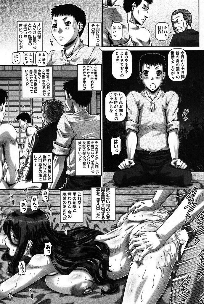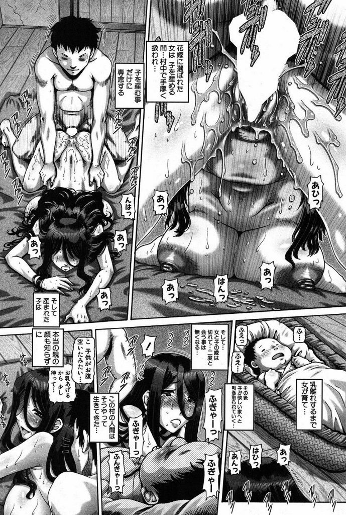 村に古くから伝わる風習で数少ない村の女を男全員で共有し里の花嫁に選ばれた女は手厚く扱われ子を産むことだけに専念し種付け役の村人たちに休む間もなく中出しされ赤子の授乳中も母乳を噴出しながら肉棒を咥え精魂尽きた男達がお世話役の少年に練習代わりに抱かせると母親だとわかりながらも近親相姦で中田氏!