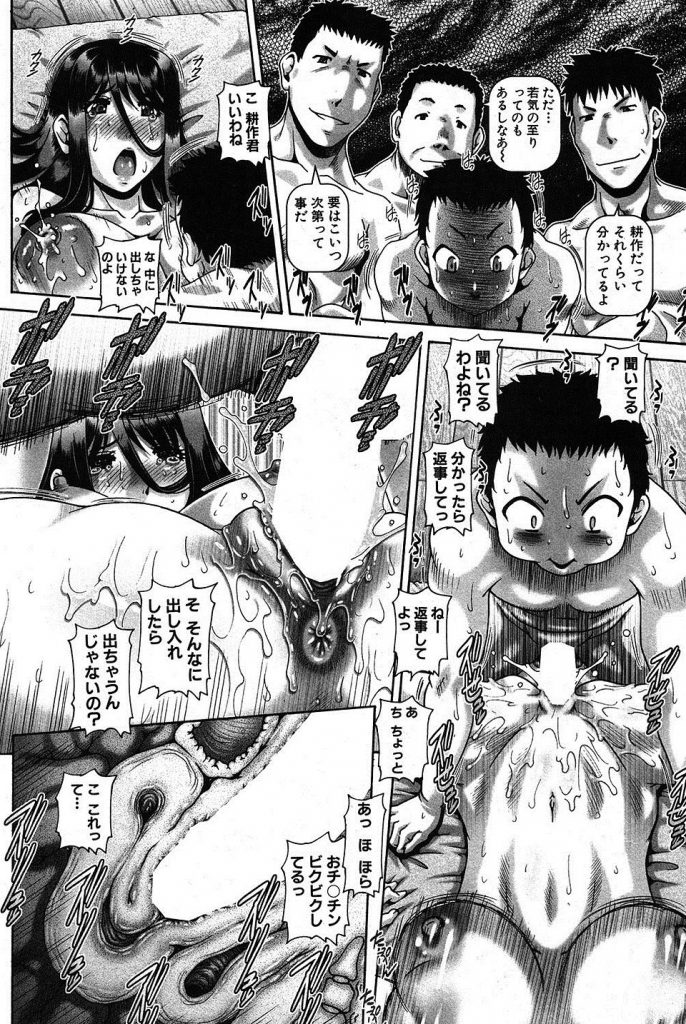 【エロ漫画】女が少ない村の風習で数少ない村の女を男全員で共有し種付け役として代わる代わる中出しする男達!