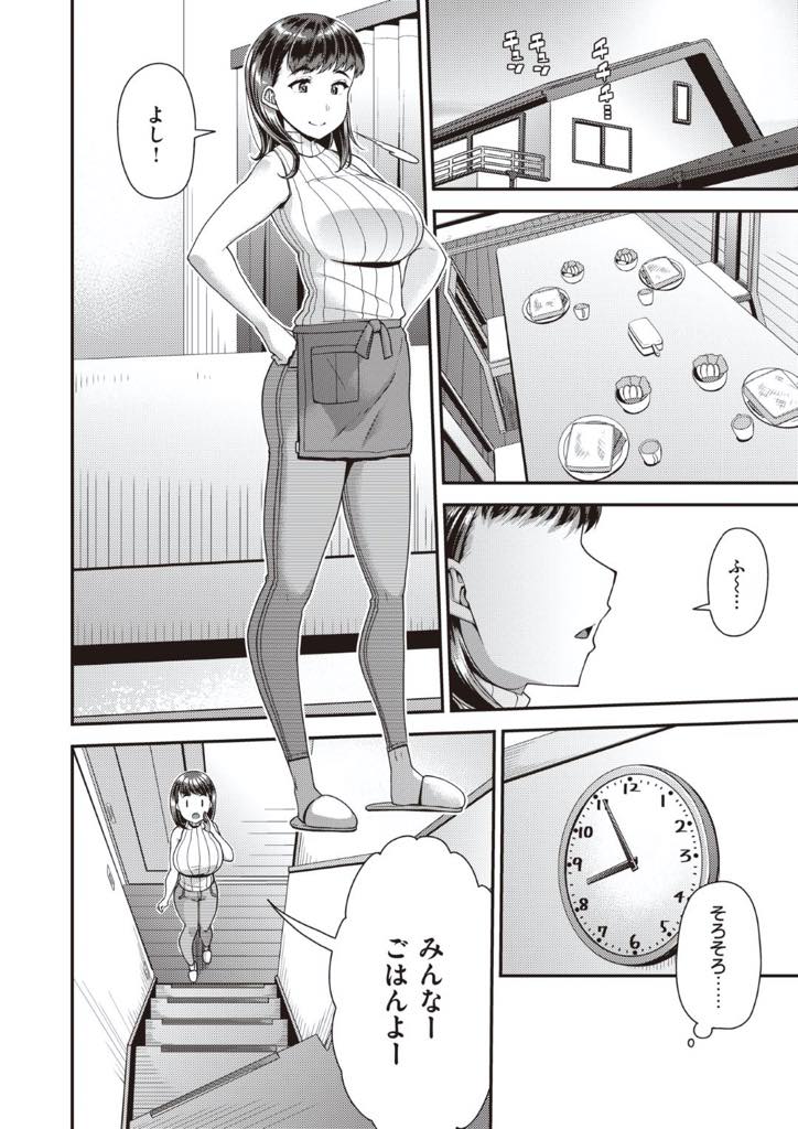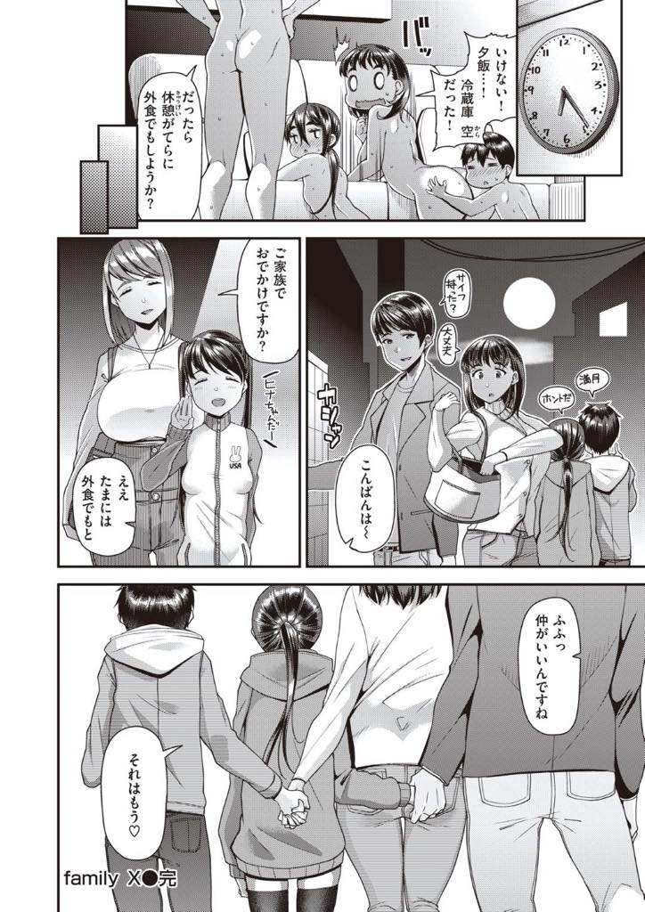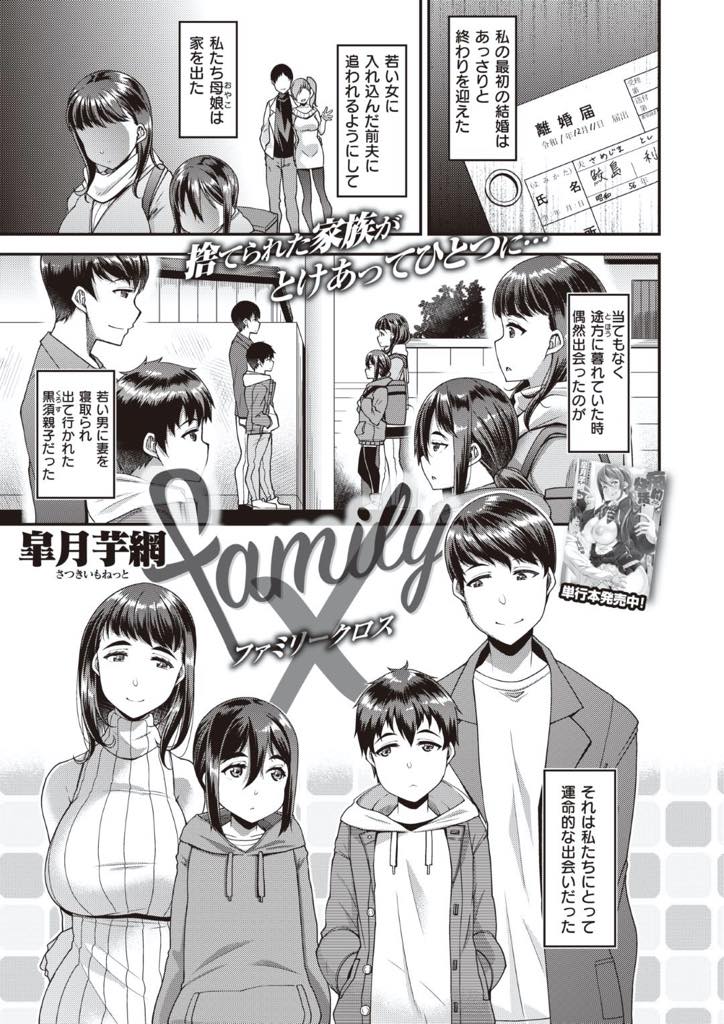 【エロ漫画】夫の浮気で離婚して家を出た母と娘は同じく離婚した父と息子の家族と出会い同居をはじめるがその組み合わせは父と娘、母と息子という複雑に絡み合った禁断のセックス