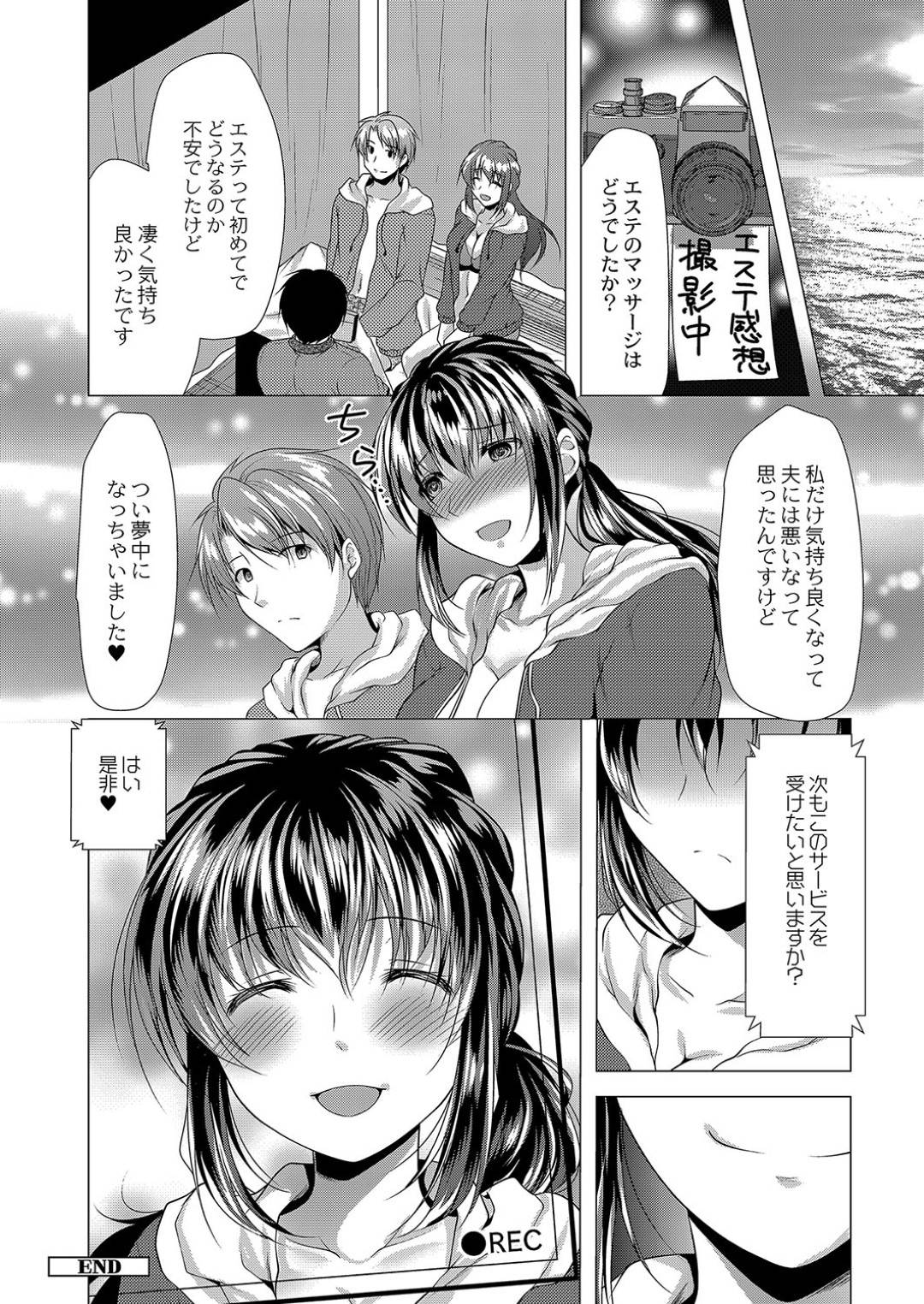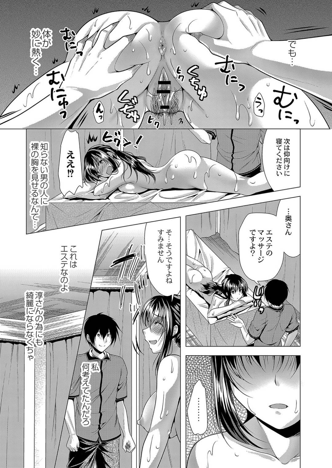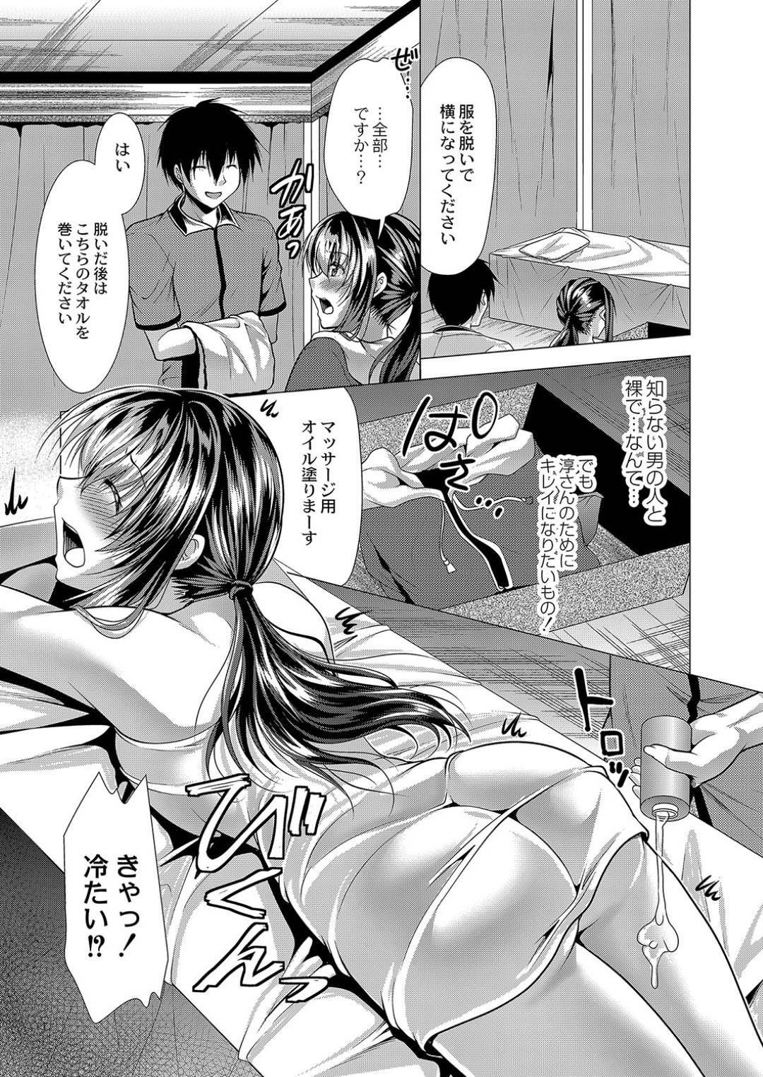 【エロ漫画】夫と海水浴に来た人妻は、エステの無料体験で性感マッサージをされ感じてしまい、生ハメレイプで中出しされてイッてしまう!
