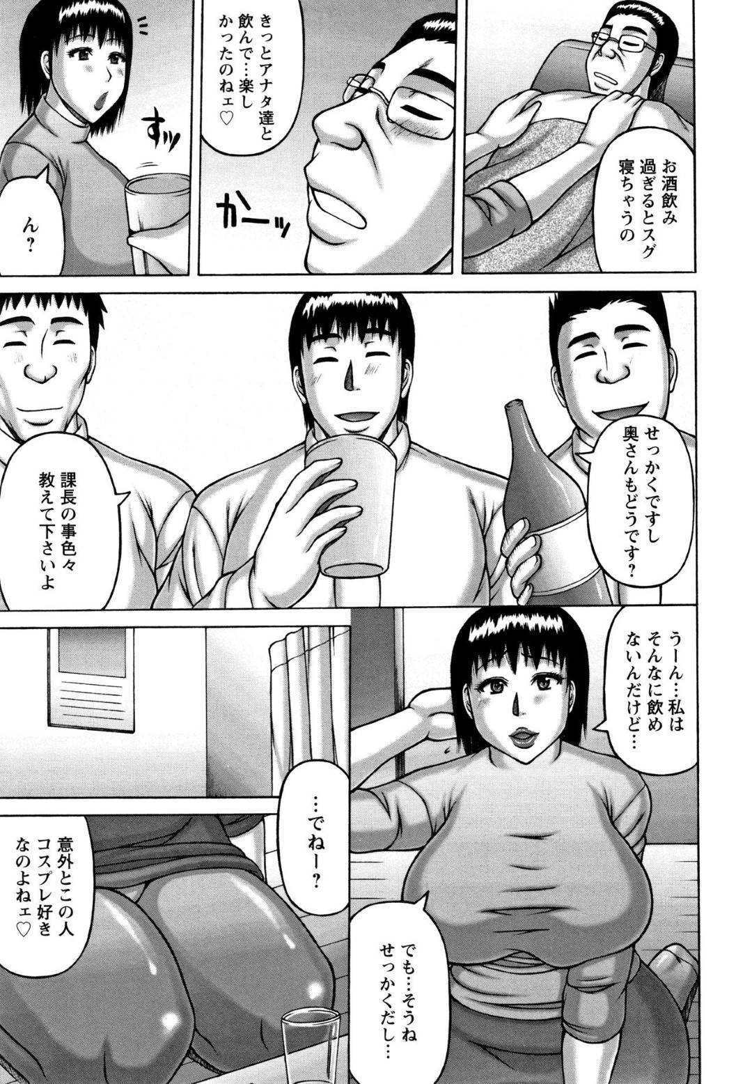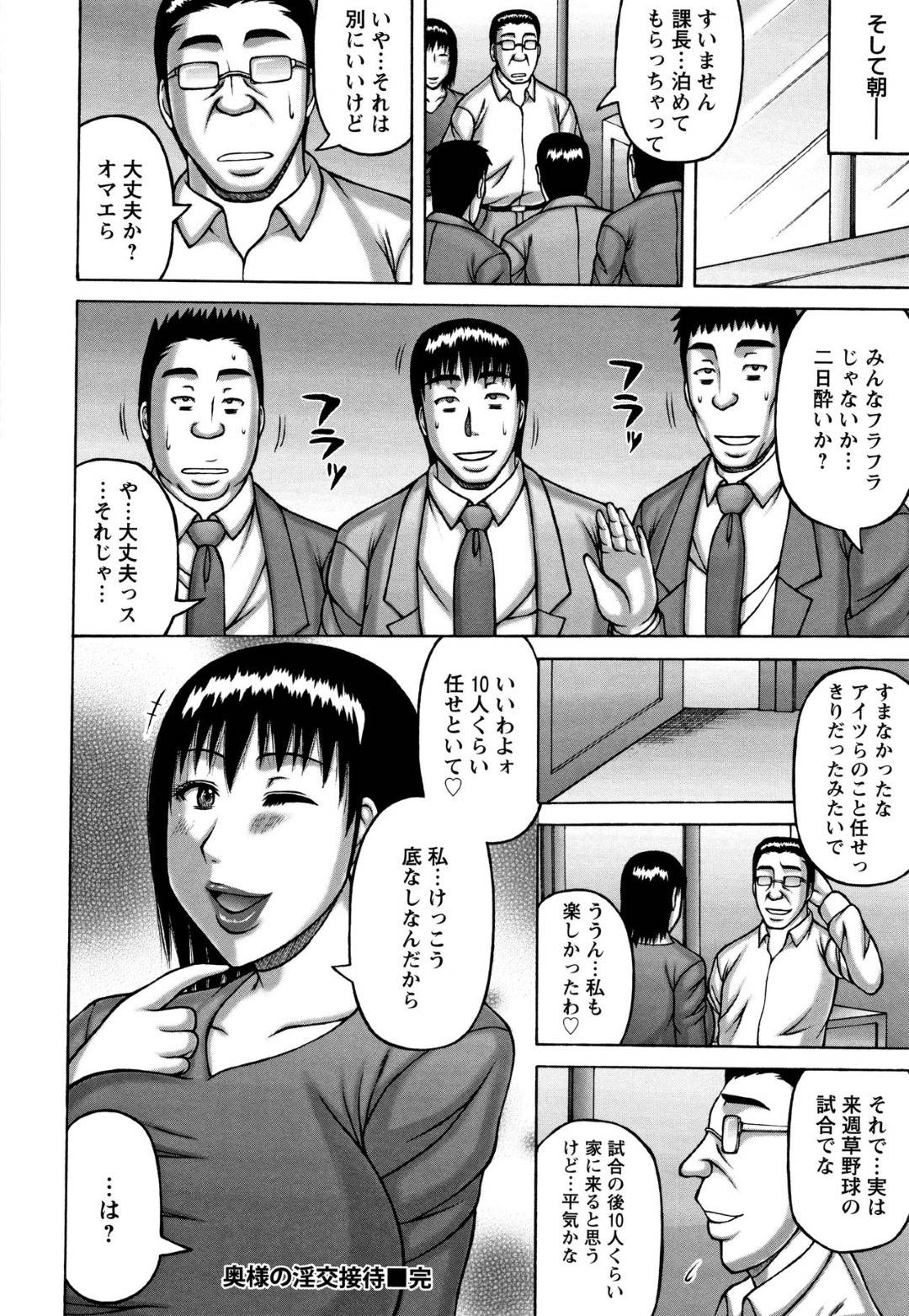 【エロ漫画】夫の部下の若い社員たちに裸エプロンコスプレを見せつけ誘惑するムチムチ奥さま。熟れた肉感ボディとタフなペニスがぶつかり合う寝取られ輪姦。絶倫人妻とデカマラの対決!