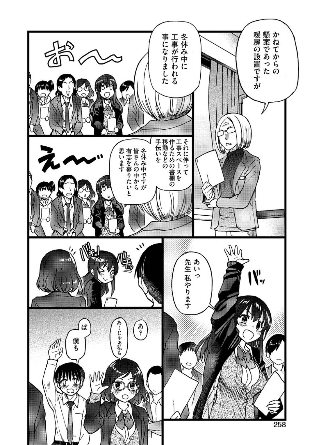 図書館の暖房設置工事が冬休中に行われることになり書棚の移動などを手伝う有志の募集に手を上げた束見さん、飯田橋さん、眉村くんの3人。もちろん3人でセックスを楽しむために自ら志願したのだがさらに特別なことに!?カバンの中にたくさんゴムを用意してきた眉村くんに…