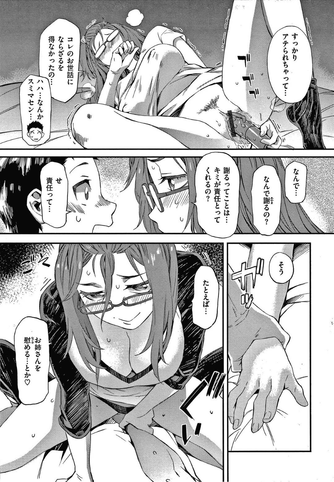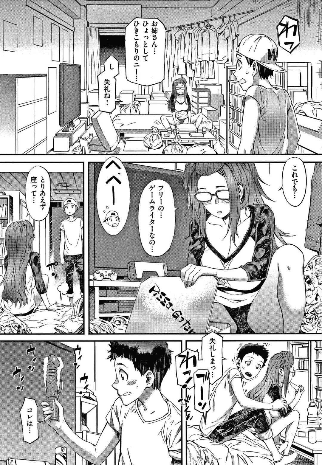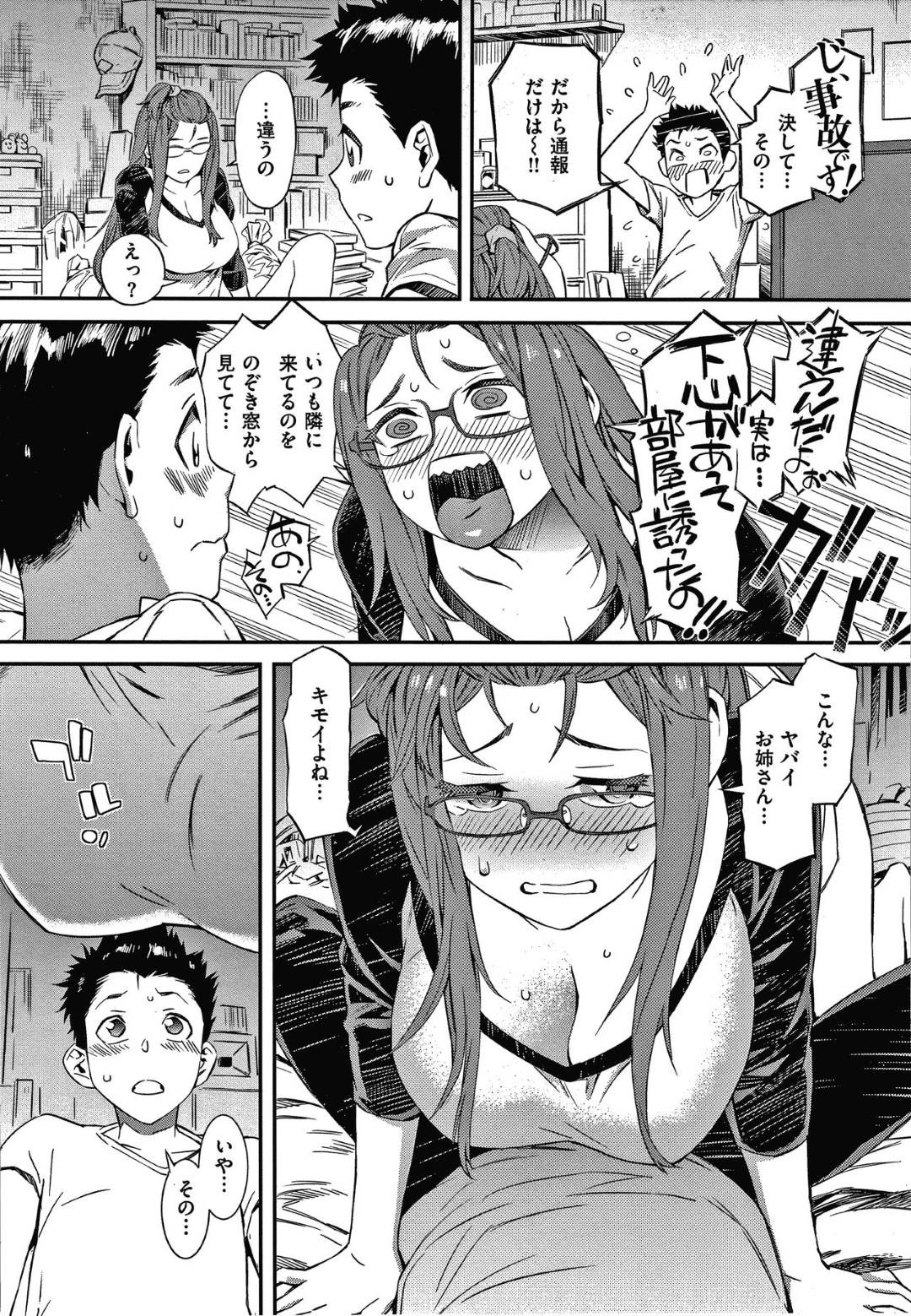 【エロ漫画】壁が薄く毎晩盛るお隣の声を聞いてムラムラが抑え切れなくなるガサツな巨乳メガネ娘。不在なお隣を訪ねてきた男の子を下心全開で部屋に誘い久々のチンコで激しい中出しセックス!
