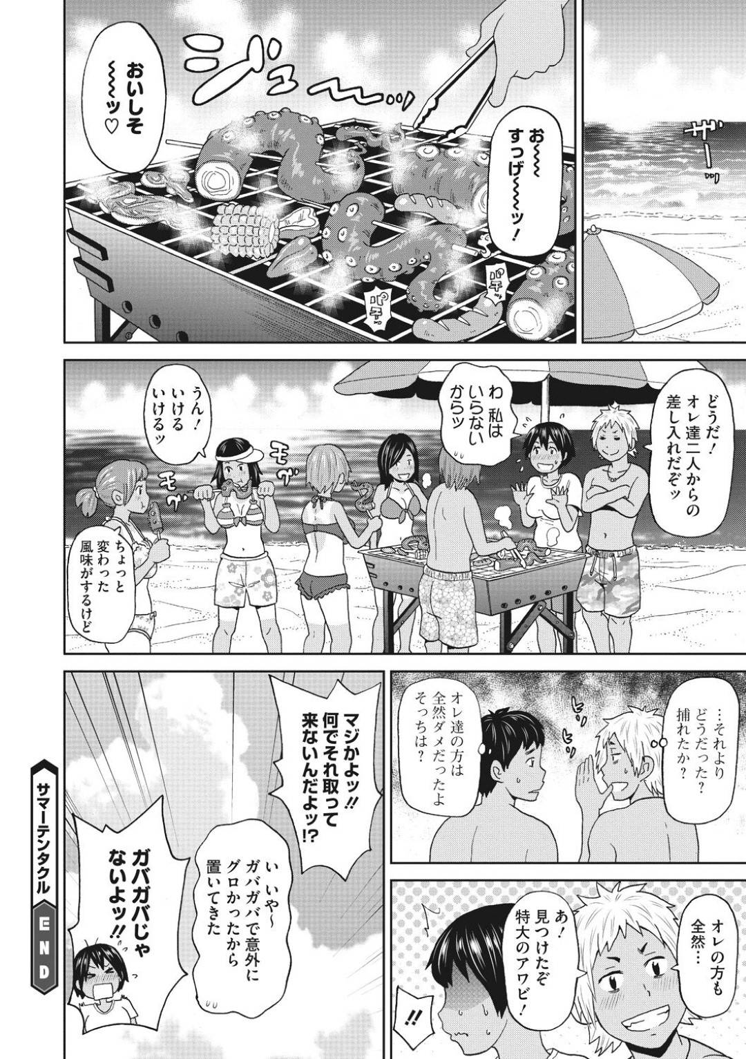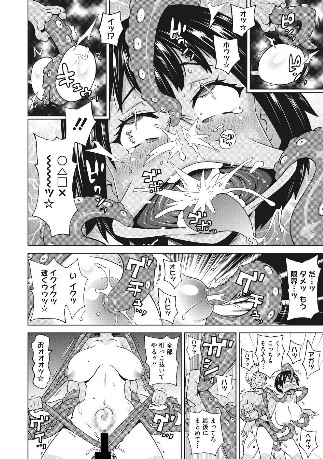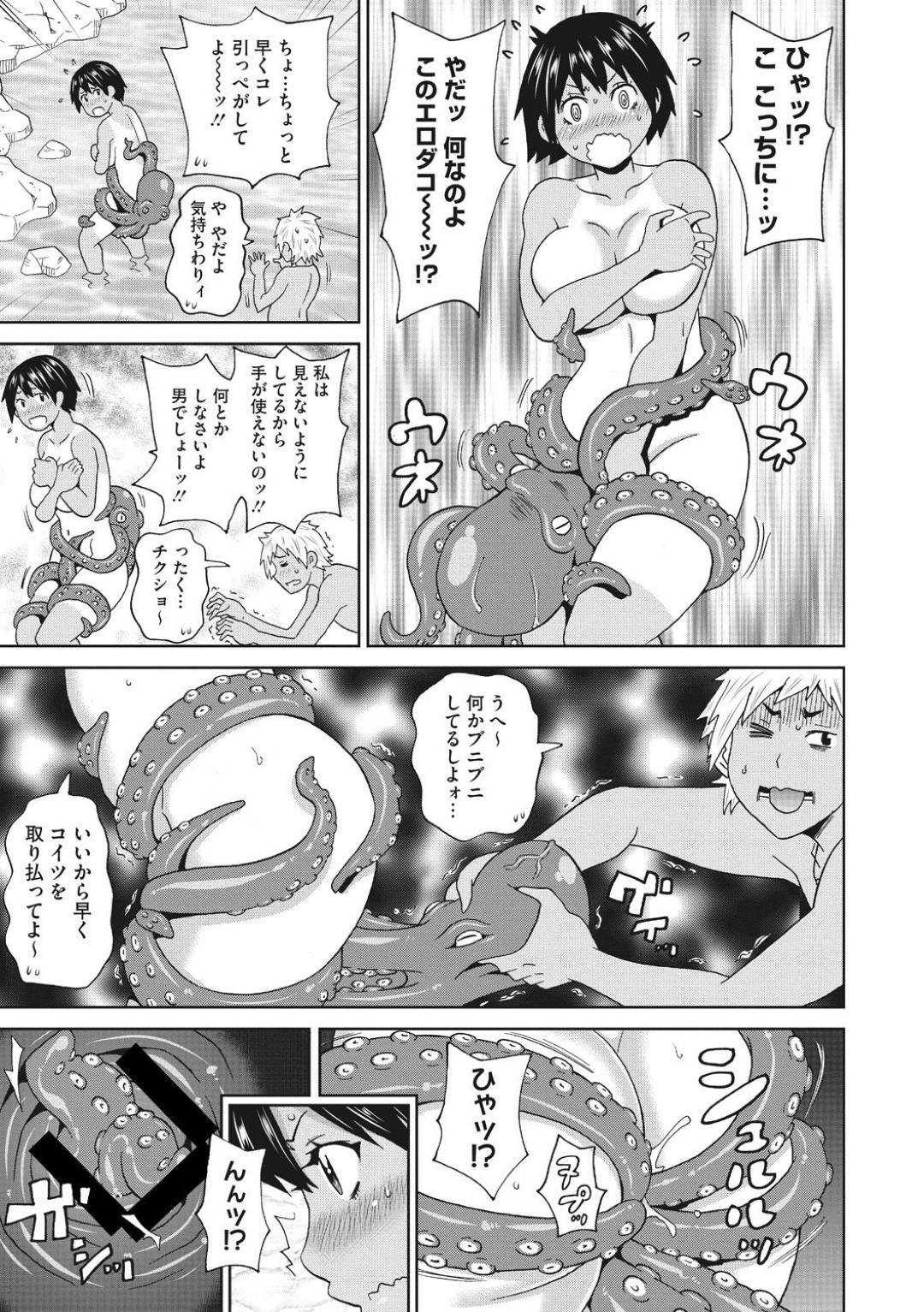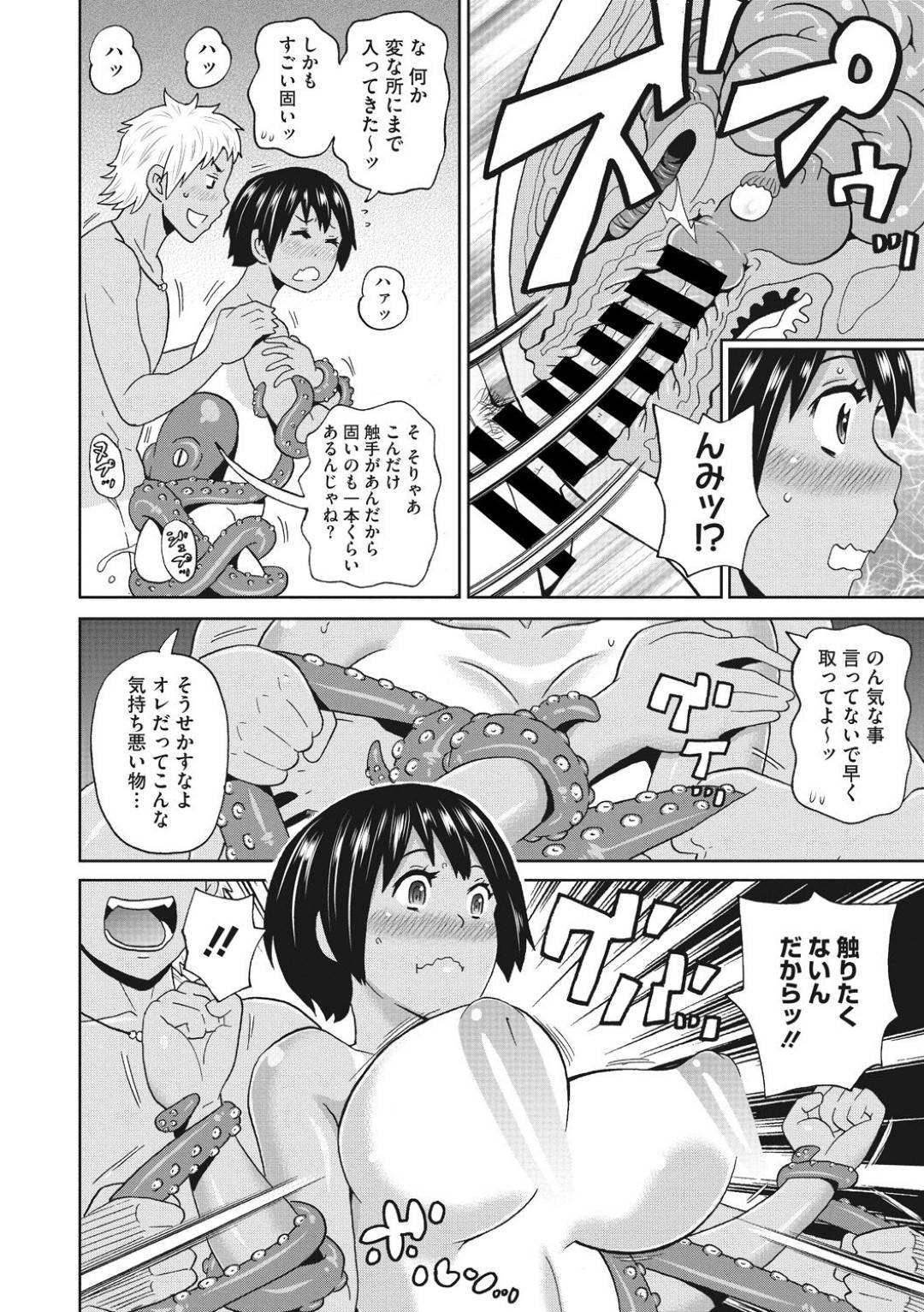 【エロ漫画】夏合宿で海へと訪れた水泳褐色娘。海で巨大タコに捕まってしまった彼女は陥没乳首や膣を責められて、アヘ顔でアクメ絶頂しまくる。