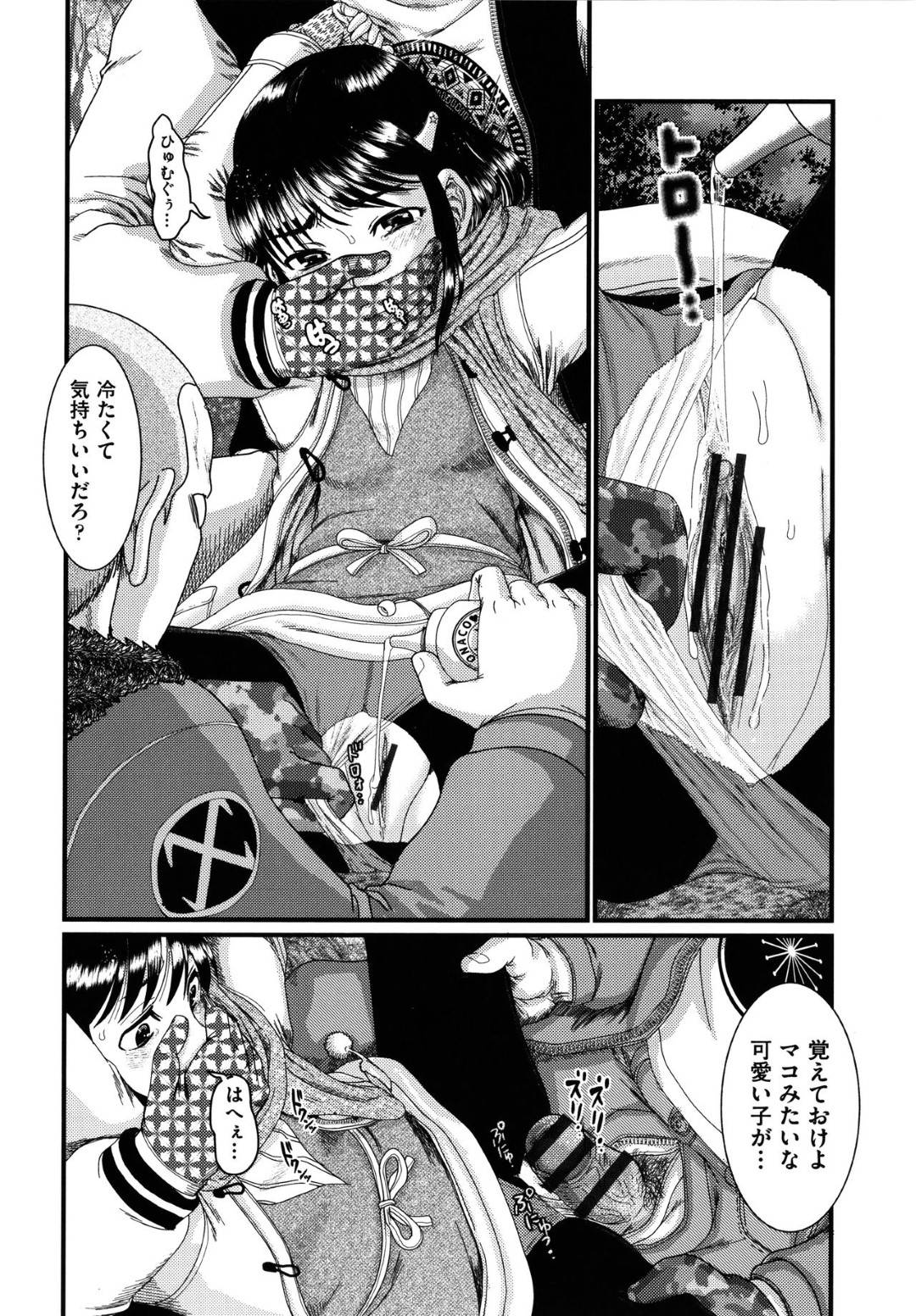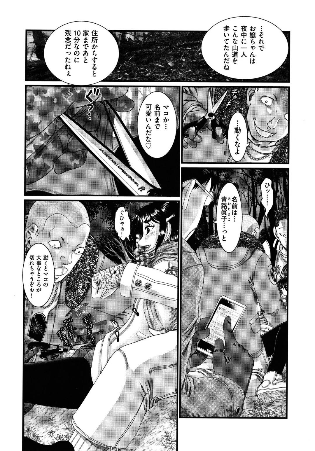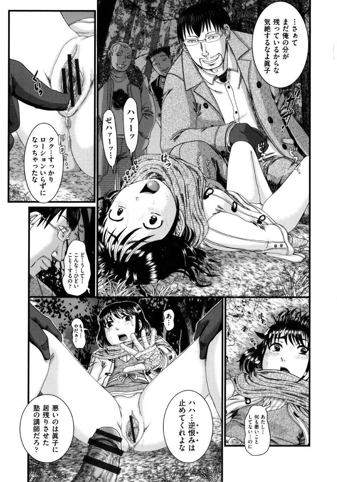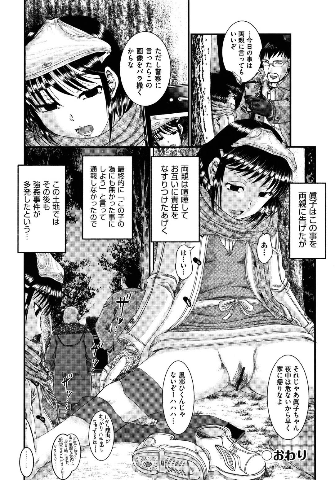 【エロ漫画】夜の森中で男たちに拉致され拘束状態の小学6年生女子。マンコのニオイを嗅がれながら徐々に迫ってくる手によって犯され、生ちんぽで青姦レイプで輪姦されてしまう!