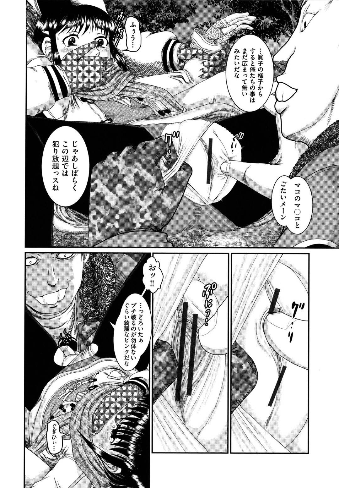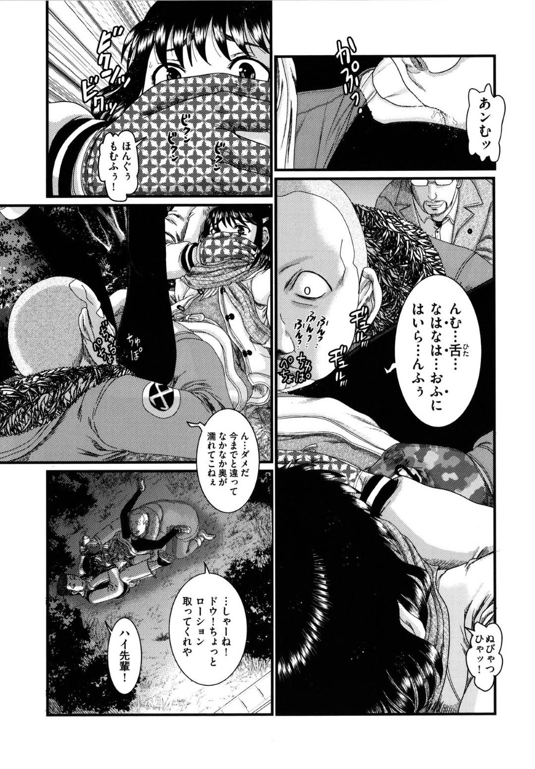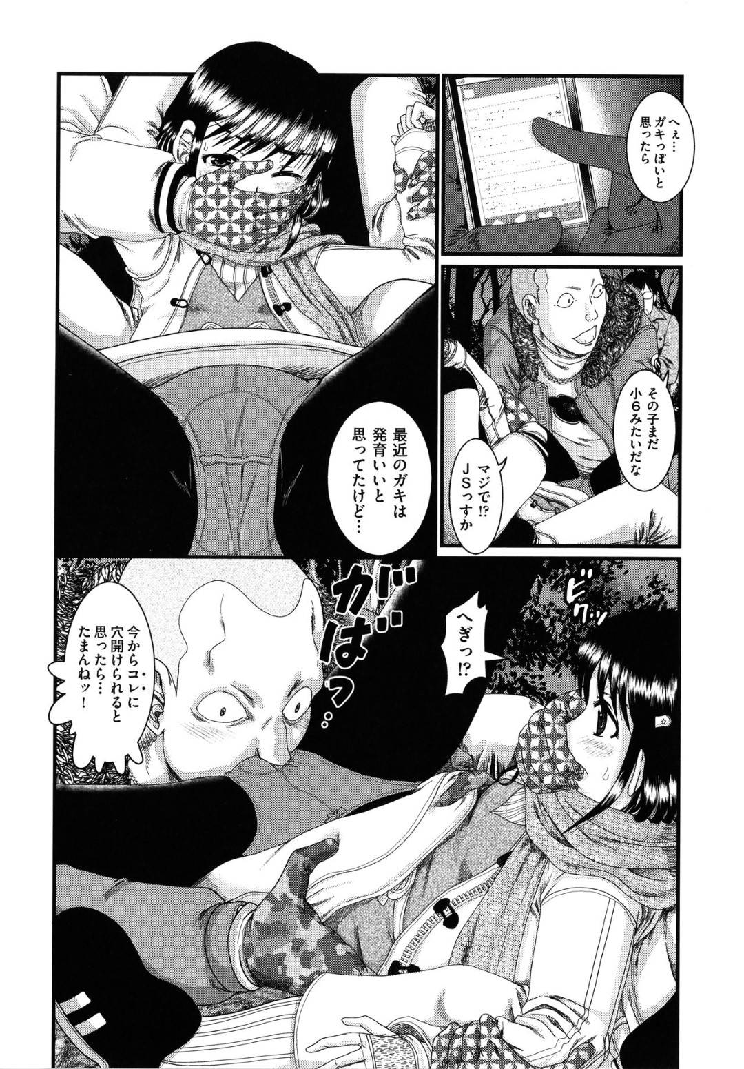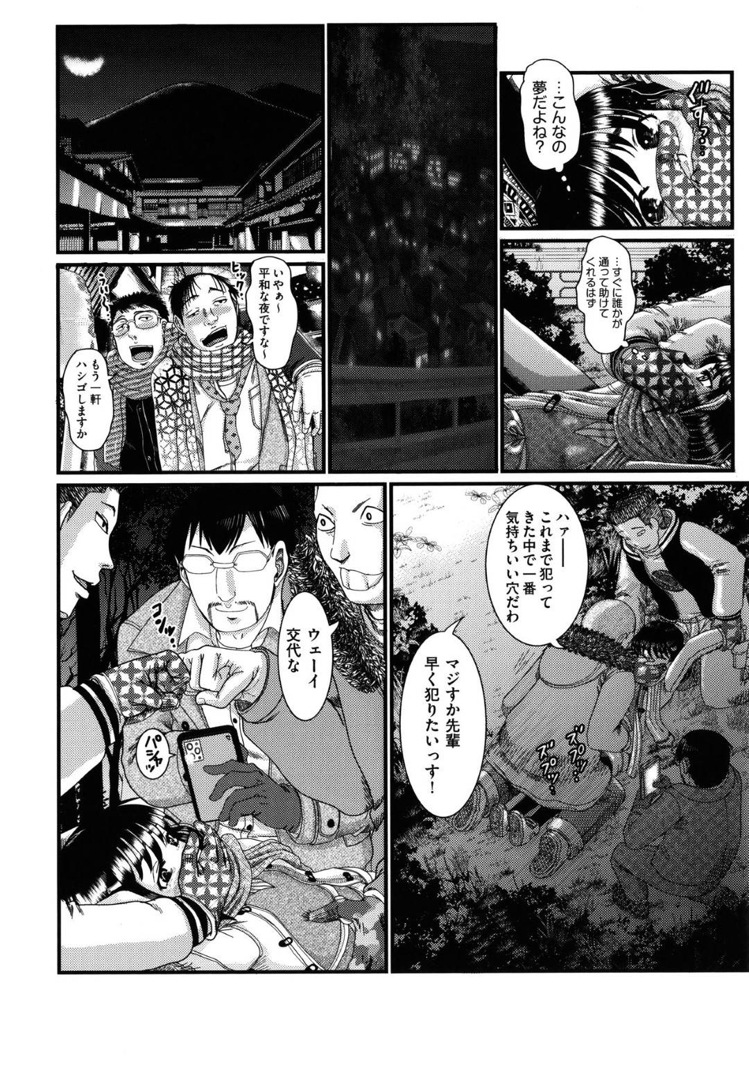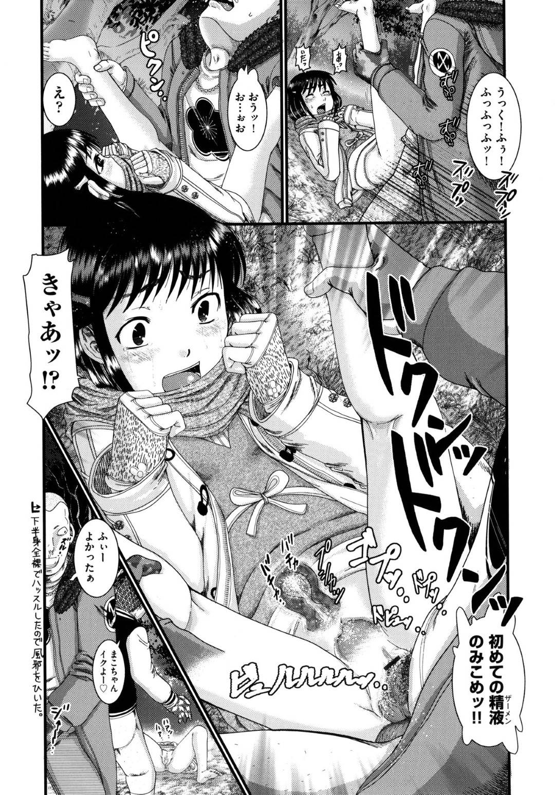 【エロ漫画】夜の森中で男たちに拉致され拘束状態の小学6年生女子。マンコのニオイを嗅がれながら徐々に迫ってくる手によって犯され、生ちんぽで青姦レイプで輪姦されてしまう!