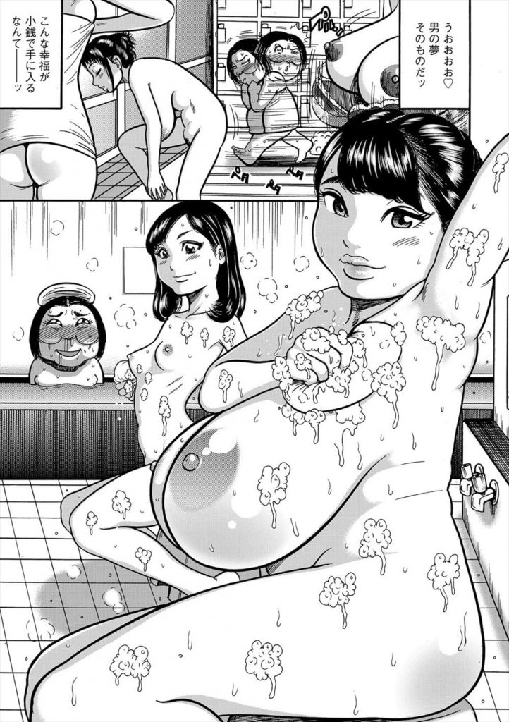 【エロ漫画】女装したキモ男がノゾキ目的で入った銭湯の女湯で欲望を吐き出しサウナで美女2人を孕ませレイプ!