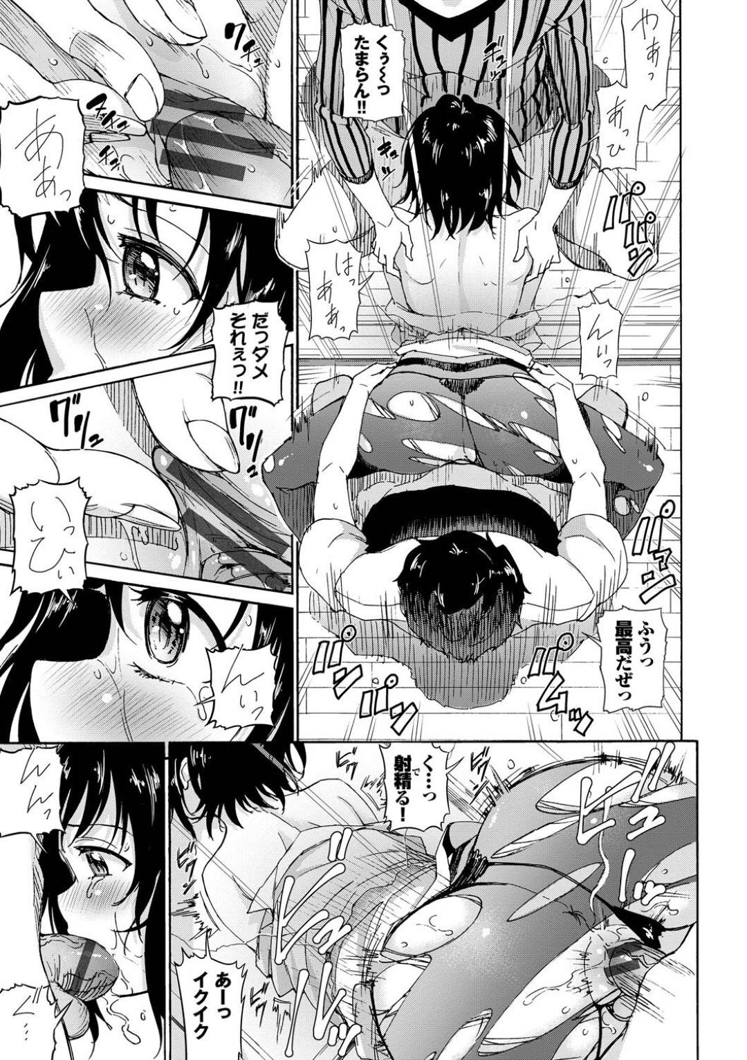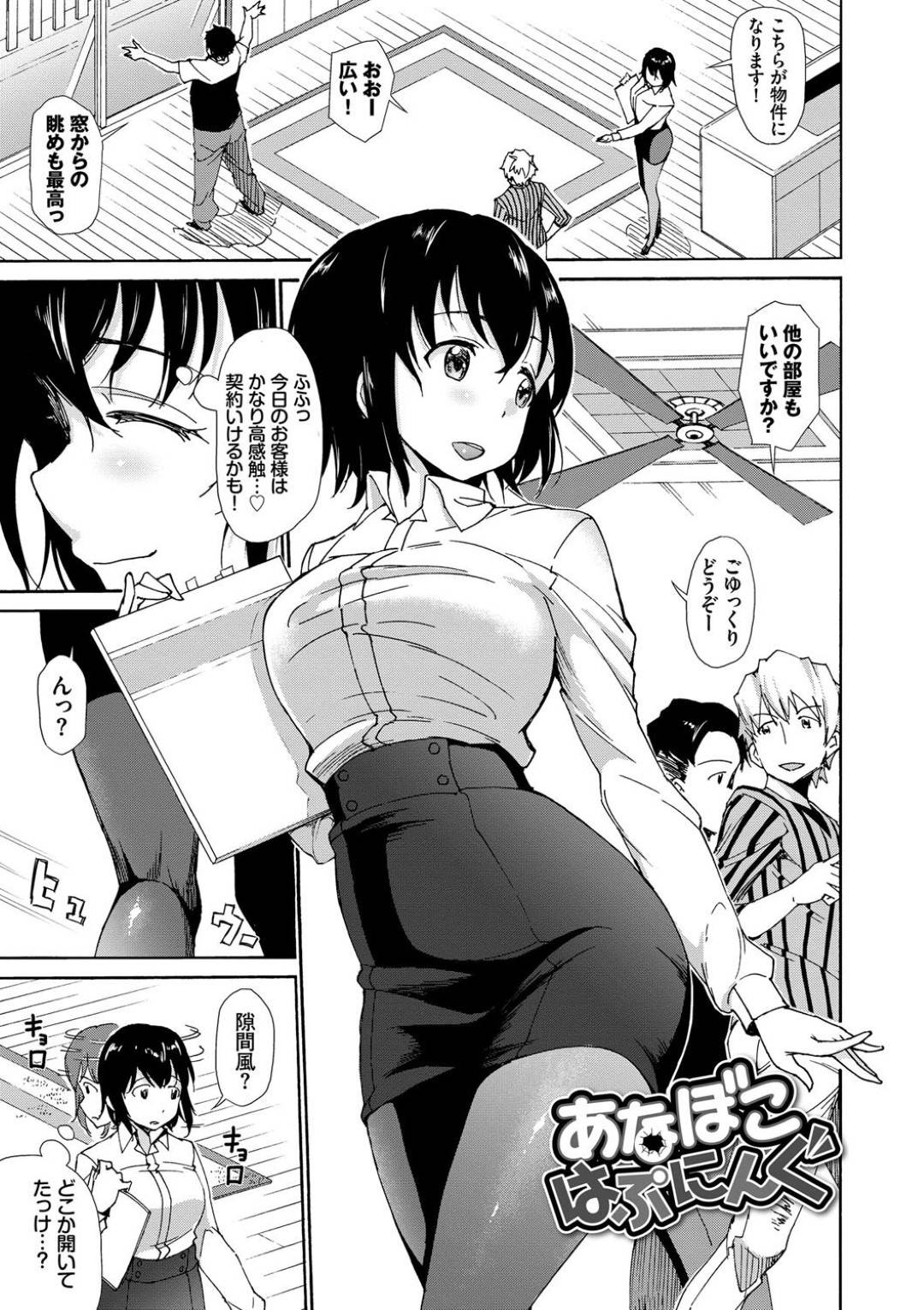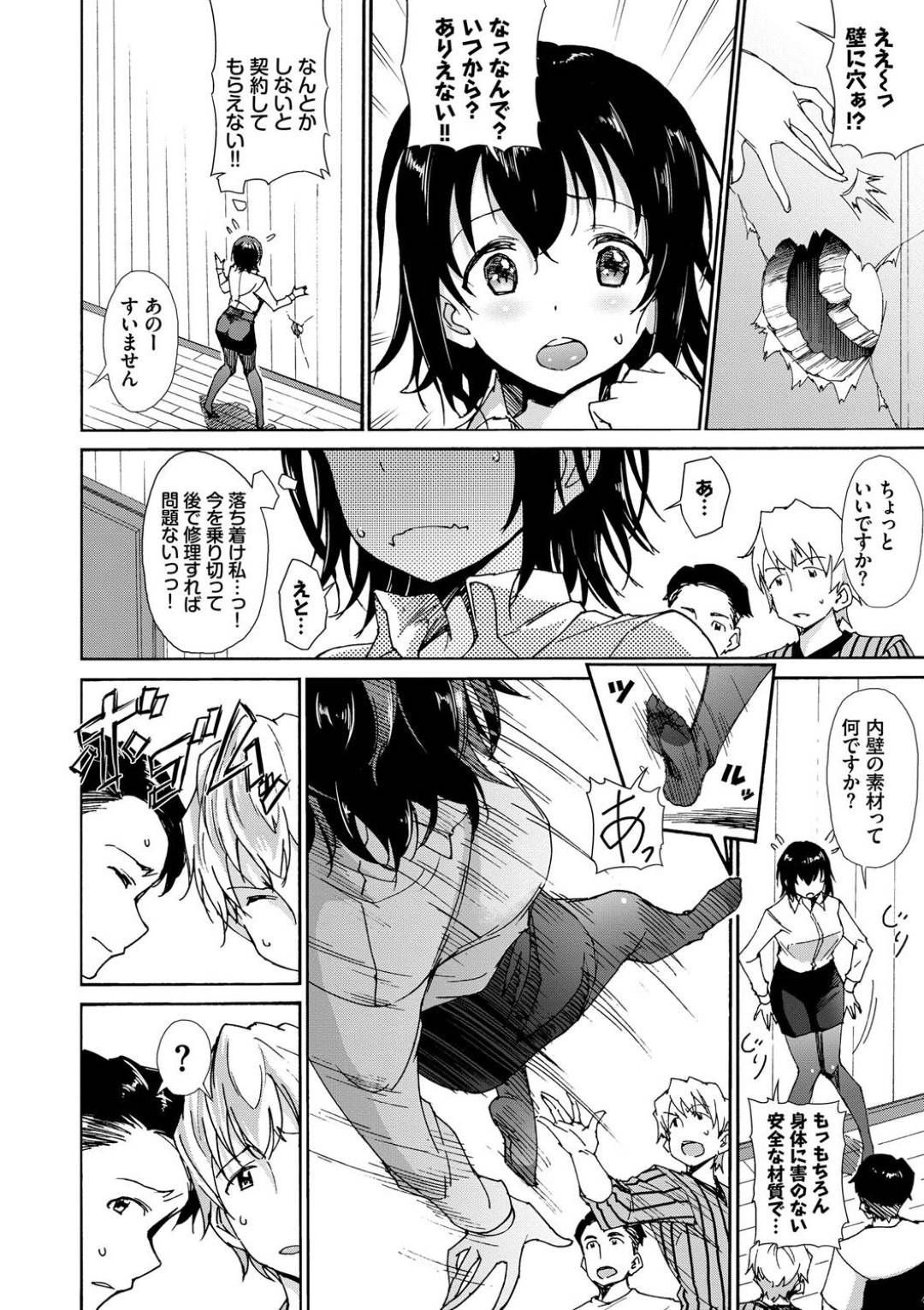 【エロ漫画】壁にハマってしまったところを客の男に欲情されてチンポをハメられてしまう不動産屋のOLお姉さん…彼女はバックからハメられたり、フェラさせられたりとやりたい放題になる!