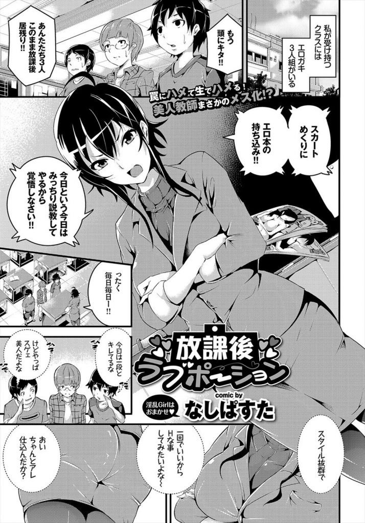 【エロ漫画】問題児のエロガキ三人組にHなイタズラで媚薬を嗅がされた美人教師が子供の容赦ない責めに淫乱メス化!