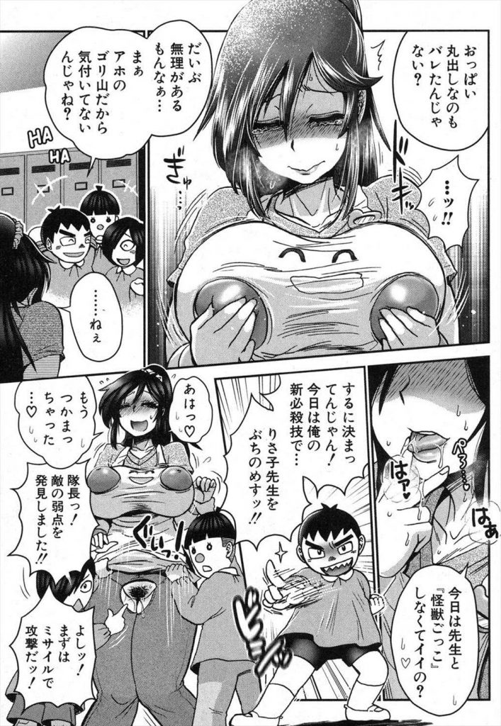 園児たちと戯れ遊ぶ先輩保育士に憧れる後輩男子が園児たちが改造したオッパイと股間部分に穴を開けた服とエプロンを着て怪獣ごっこでオマンコとニップルにフィストパンチされ変態遊びを楽しんでいるとイジメと勘違いした後輩男子の肉棒を膣に挿入して園児たちのフィストも加わり4穴責めで失神アクメする保育士は今日も子供と戯れる!