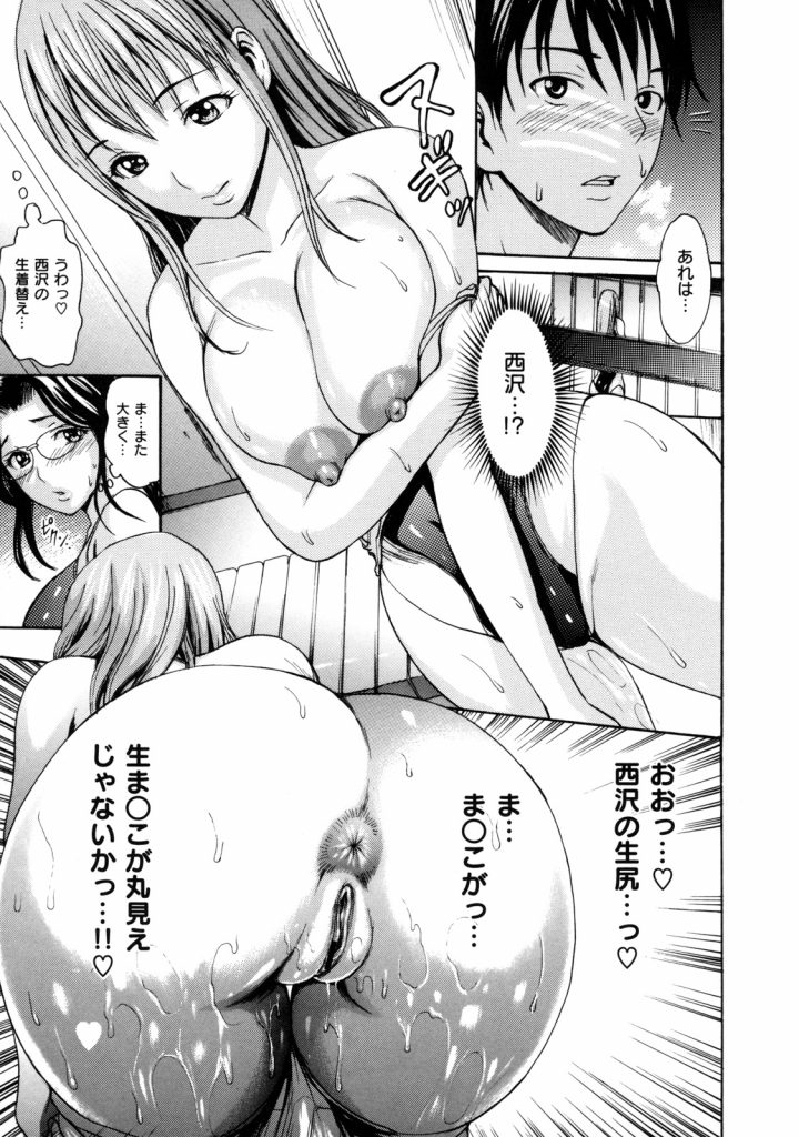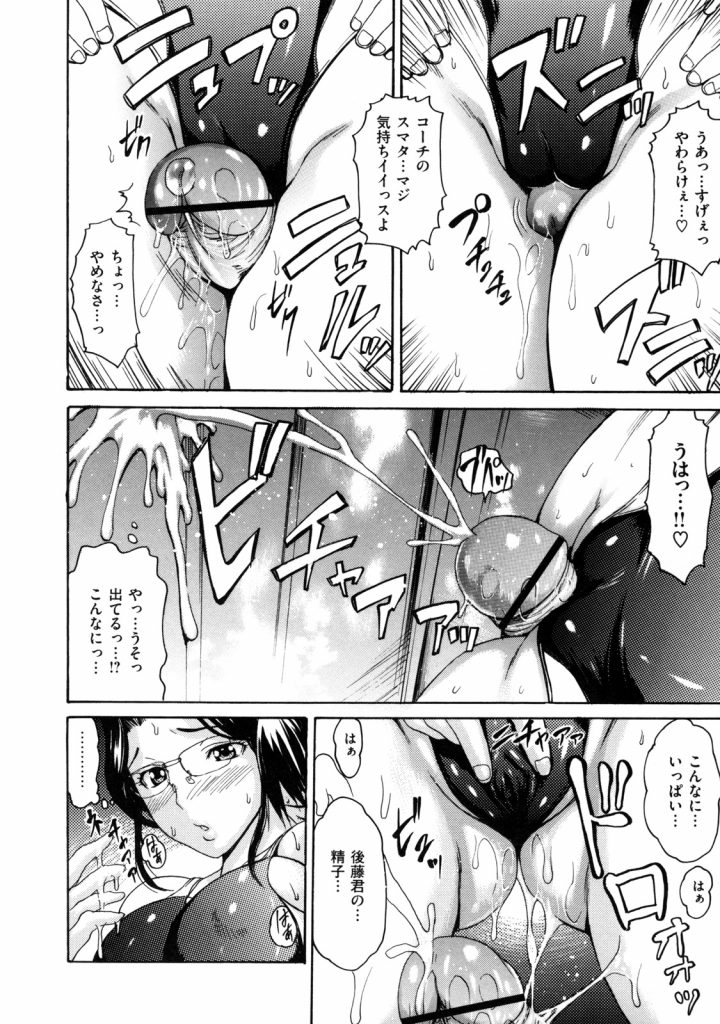 【エロ漫画】女子更衣室に隠しカメラを仕掛けた男がダイナマイトボディのコーチに見つかりロッカー内で立ちハメ生だし!