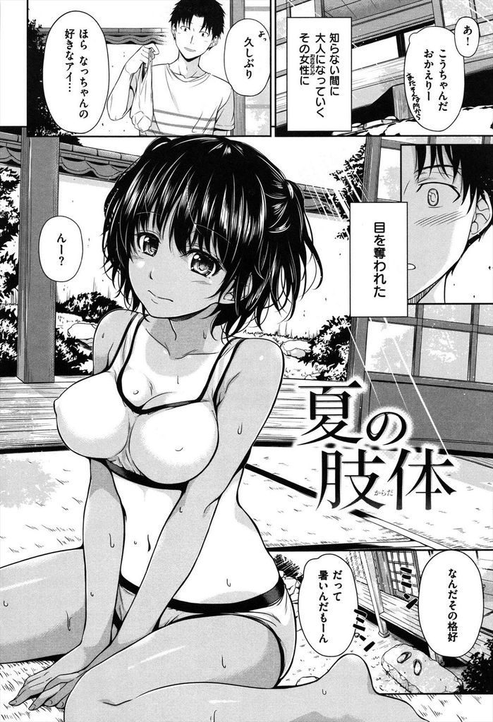 当たり前の様に小さな頃から一緒だった幼馴染の少女と中学卒業を期に離れ夏休みに再会すると大人の女に成長していく幼馴染の部屋着姿に目を奪われ目のやり場に困っていたが後ろから抱きしめオッパイをモロ出しにして吸い付くと日焼け跡のエロい引き締まった身体を愛撫してオマンコを弄り一気にチンポをぶち込んでイチャラブエッチ体験!